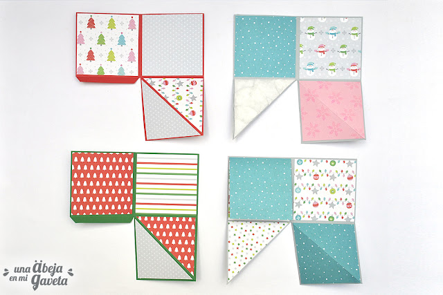 Podemos crear ventanas como estas. Bien, que se vea por los lados, o que solo se vea por uno. Podemos añadir un fondo pegando un trozo de papel decorado en la otra cara. Podemos proteger estas ventanas con acetato y, si no queremos que se vea nítido, añadir además un trozo de vellum. Por cierto!! Para este caso de la ventanita roja me equivoqué y pegué el trozo en la cartulina verde. Después rectifiqué y lo pegué en una de las piezas que tenía la cartulina gris.