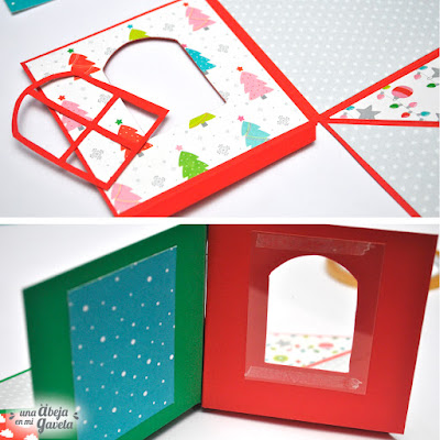 Después de estar un rato en la nieve apetece entrar en casa en busca del calorcito así que en esta última parte nos encontramos en una casa con el árbol de navidad puesto. Está hecho con cartulina y sobre ella, un acetato para colocar los enamels y que se puedan reutilizar sin problemas. En la ventana nos encontramos con Papá Noel, que sigue persiguiendo al reno ;) Realmente pertenece a una tarjeta que he colocado en el interior de ese bolsillo. Y, al sacarla, vemos el papel decorado que habíamos pegado previamente.